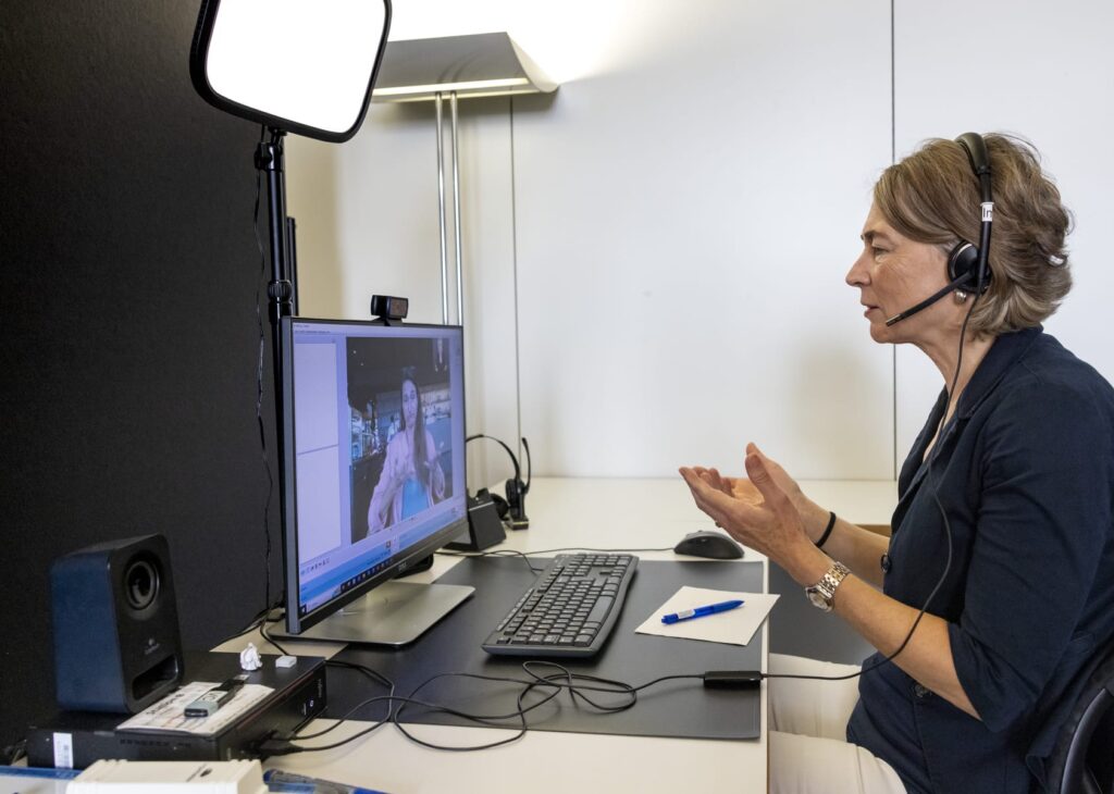 Und so funktioniert es: Mit dem Programm myMMX werden Sie als gehörlose Person mit eine:r Dolmetscher:in über Video verbunden. Die Dolmetscher:in wählt die von Ihnen gewünschte Nummer. Die hörende Person benutzt das Telefon.